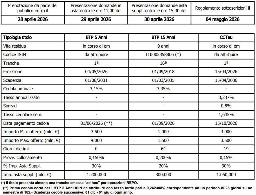 Il MEF annuncia l’emissione dei seguenti titoli di Stato e il relativo calendario per le operazioni di sottoscrizione: